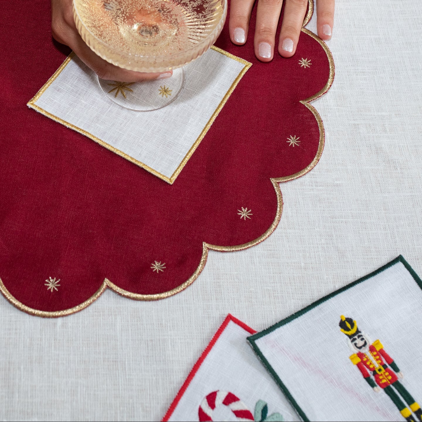 The collection includes linen placemats, napkins, cocktail napkins, and tablecloths — all designed with attention to detail and style.